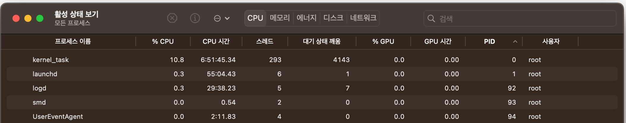 프로세스에 대해 알아봤습니다. 원래는 스레드까지 포함하려 했는데 너무 방대해지는 것 같아서 나눠서 좀 뚝 끊긴 느낌이 드네요. macOS는 활성 상태 보기를 통해 CPU에 대한 정보를 얻을 수 있습니다.  맥에서 킨 활성 상태 이전 글에서 배운 커널도 보이네요 (PID = 0) launchd는 커널이 컴퓨터를 설정하기 위해 실행하는 첫 번째 프로세스라고 합니다 (PID = 1) (https://support.apple.com/ko-kr/guide/terminal/apdc6c1077b-5d5d-4d35-9c19-60f2397b2369/mac) 공부를 하니 뭔가 조금씩 보이기 시작해서 재미있네요 😁 읽어주셔서 감사합니다. 참고