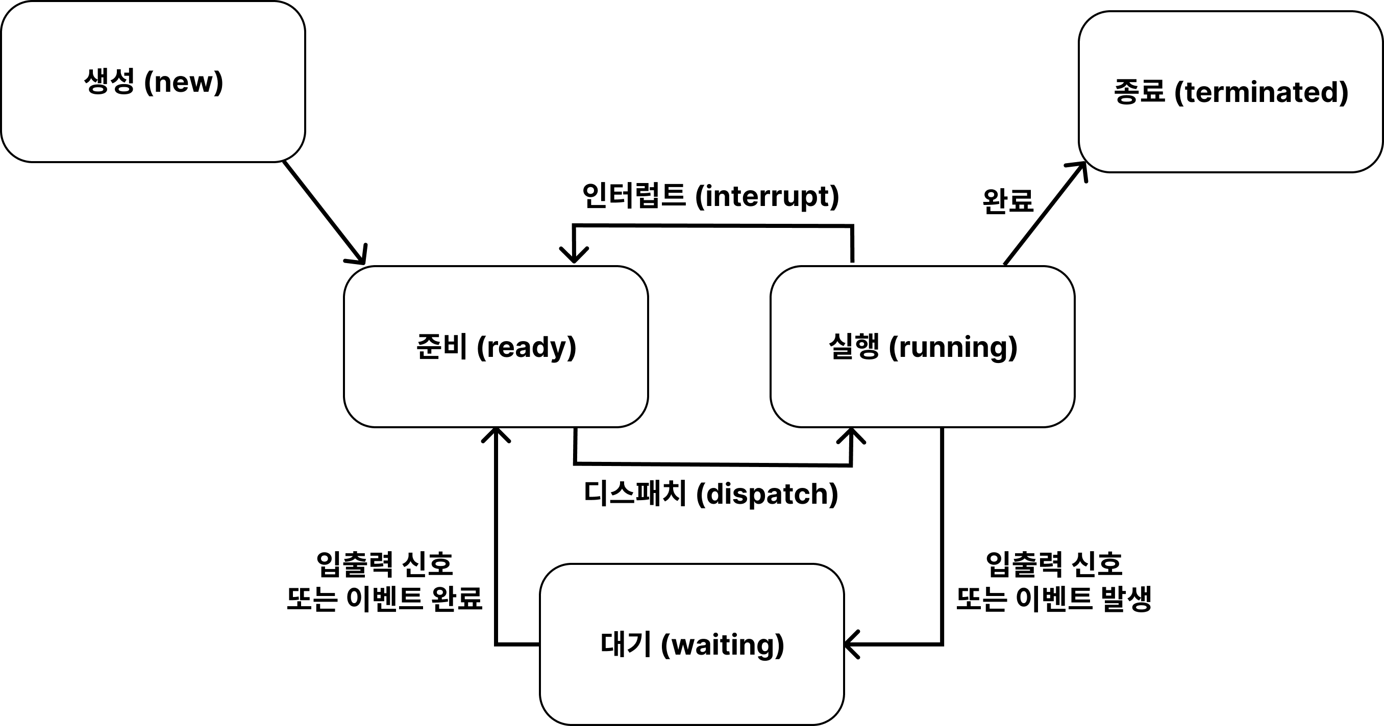 - 도중에 입출력 신호 또는 이벤트가 발생하면 waiting 상태가 될 수 있음