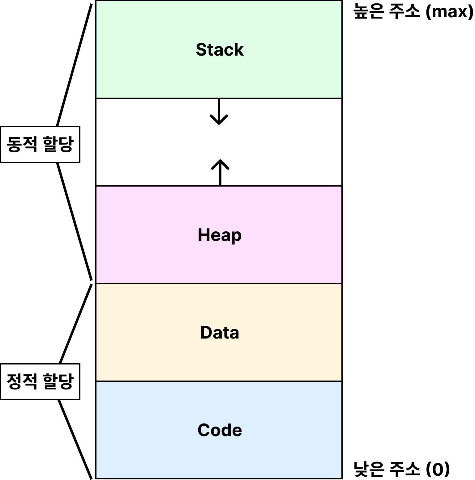 Code, Data 영역은 도중에 값이 추가/제거가 되지 않습니다. (프로그램 실행 도중 코드가 변경되거나 전역 변수가 어디서 추가되는 일이 없음) 즉 크기가 고정되어 있어 '정적 할당 영역'이라고 부릅니다. Heap 영역 - 코드에서 동적으로 데이터를 할당하는 영역입니다.
