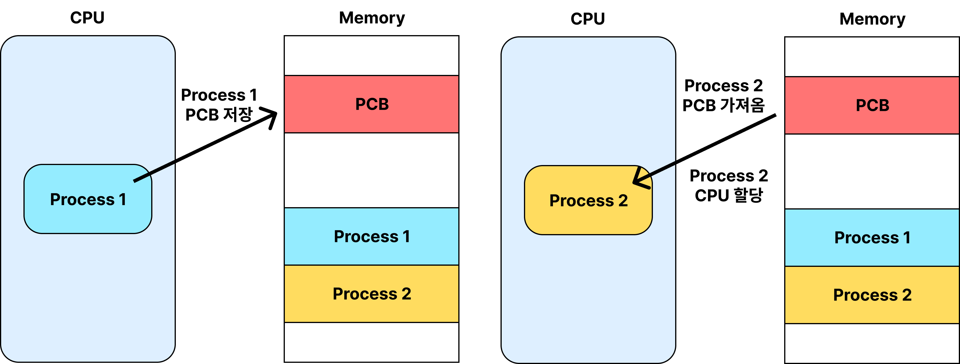 왜 PCB가 존재?모든 프로세스가 CPU를 동시에 사용할 수 없습니다. 만약 가능하다면? 인터넷 창 키고 터미널 키고 등 여러 프로그램을 실행시키려면 그만큼 CPU가 필요할 것입니다. 즉 프로세스는 CPU의 스케줄링을 통해 프로세스들에게 적절하게 CPU를 점유할 수 있도록 합니다. 이때 진행 중이던 프로세스가 멈췄다가 다시 실행하기 위해서는 기존 정보가 필요합니다. 이 정보가 PCB입니다. 문맥 교환(Context Switching)