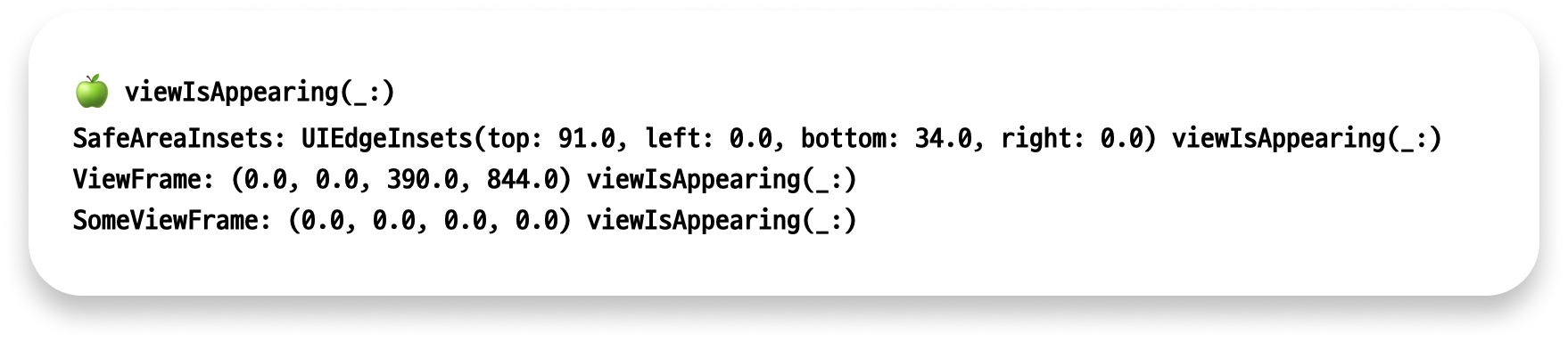override func viewIsAppearing(_ animated: Bool) { super.viewIsAppearing(animated) print("🍏", #function) print("SafeAreaInsets:", view.safeAreaInsets, #function) print("ViewFrame:", view.frame, #function) print("SomeViewFrame:", someView.frame, #function) }