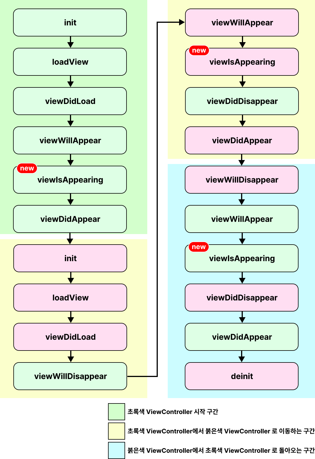 2개의 ViewController Life Cycle 초록색 ViewController (aka. GVC) 에서 붉은색 ViewController (aka. RVC)로 이동할 때를 살펴봅시다.