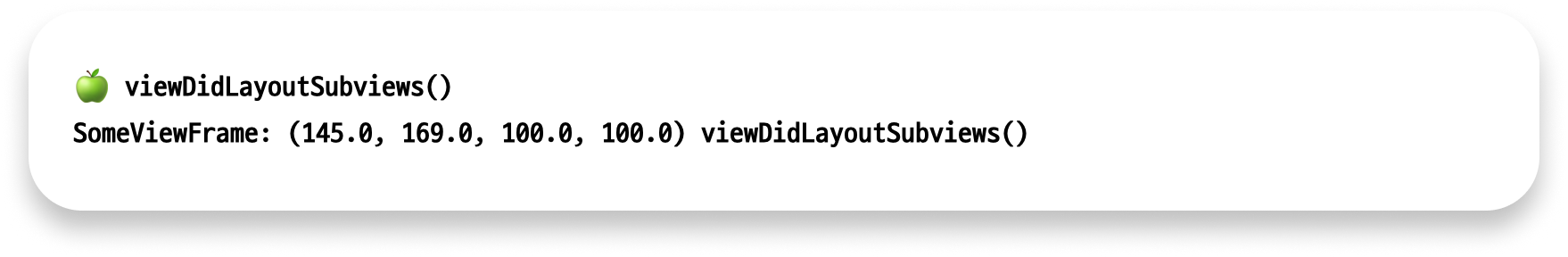 override func viewDidLayoutSubviews() { super.viewDidLayoutSubviews() print("🍏", #function) print("SomeViewFrame:", someView.frame, #function) }