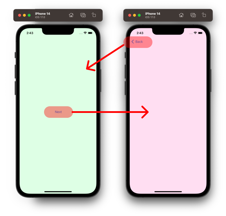 NavigationController를 활용하여 ViewController 이동 초록색 ViewController 에서 붉은색 ViewController 로 이동하고 다시 돌아올 때 ViewController가 호출하는 메소드를 살펴봅시다.