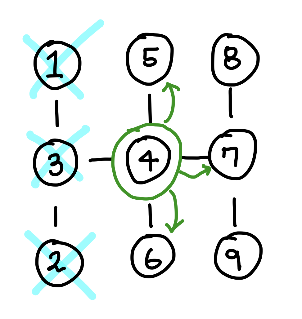 nodes[next] 는 nodes[3] 이고 이 배열에는 [ 1, 2, 4 ] 가 들어있다.